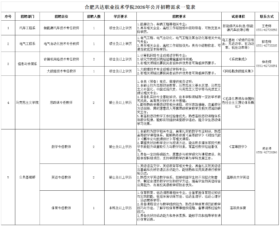 合肥共达职业技术学院2026年公开招聘需求一览表(请点击链接查看详情)三、招聘条件