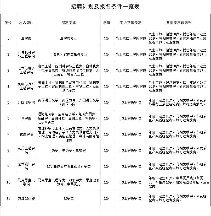 学校秉承开放式办学理念,广纳贤才,热忱欢迎高校优秀毕业生和各行业有志之士投身高等教育事业,到校工作。当前,学校蓬勃发展,办学规模日益扩大,根据教育教学工作需要,现招聘教师若干人,具体要求如下。